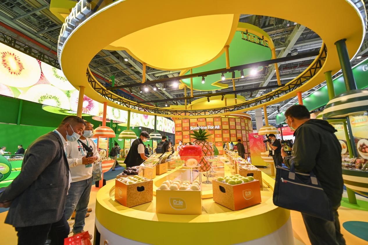 Fresh fruits produced around the world are exhibited at the Food and Agricultural Products Exhibition Area of the 4th China International Import Expo (CIIE) on Nov. 6, 2021, the second day of the event. (People’s Daily/Jiang Yushi)