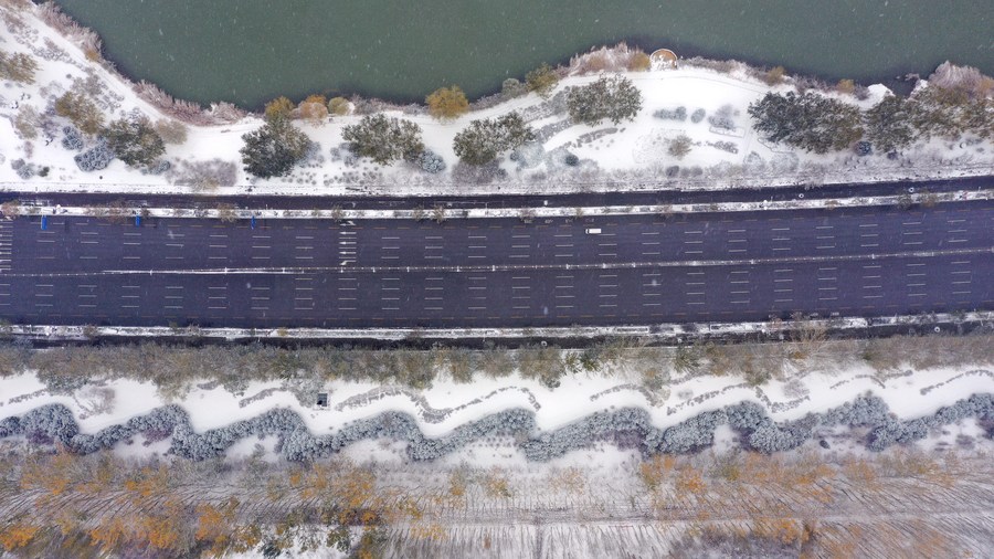Aerial photo taken on Nov. 6, 2021 shows a snow scene in Yinchuan, northwest China's Ningxia Hui Autonomous Region. Yinchuan witnessed the first snowfall this winter Saturday. (Xinhua/Wang Peng)