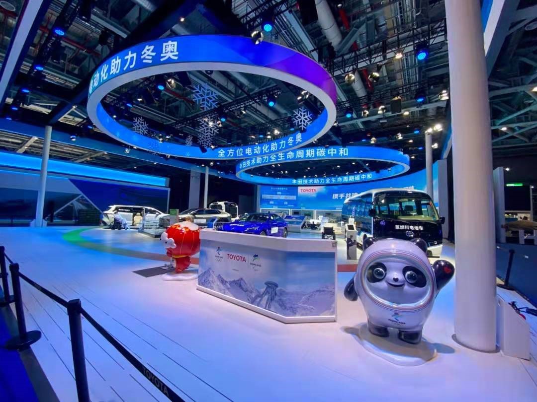 Mascots of Beijing 2022 Winter Olympics and Paralympic Games Bing Dwen Dwen and Shuey Rhon Rhon are exhibited at the automobile exhibition area of the 4th China International Import Expo, Nov. 4, 2021. (People’s Daily/Ju Yunpeng)