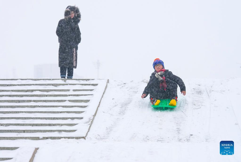 Citizens have fun in the snow in Changchun, northeast China's Jilin Province, Nov. 7, 2021. The traditional solar term of Lidong, the beginning of winter, fell on Nov. 7 this year. (Xinhua/Xu Chang)