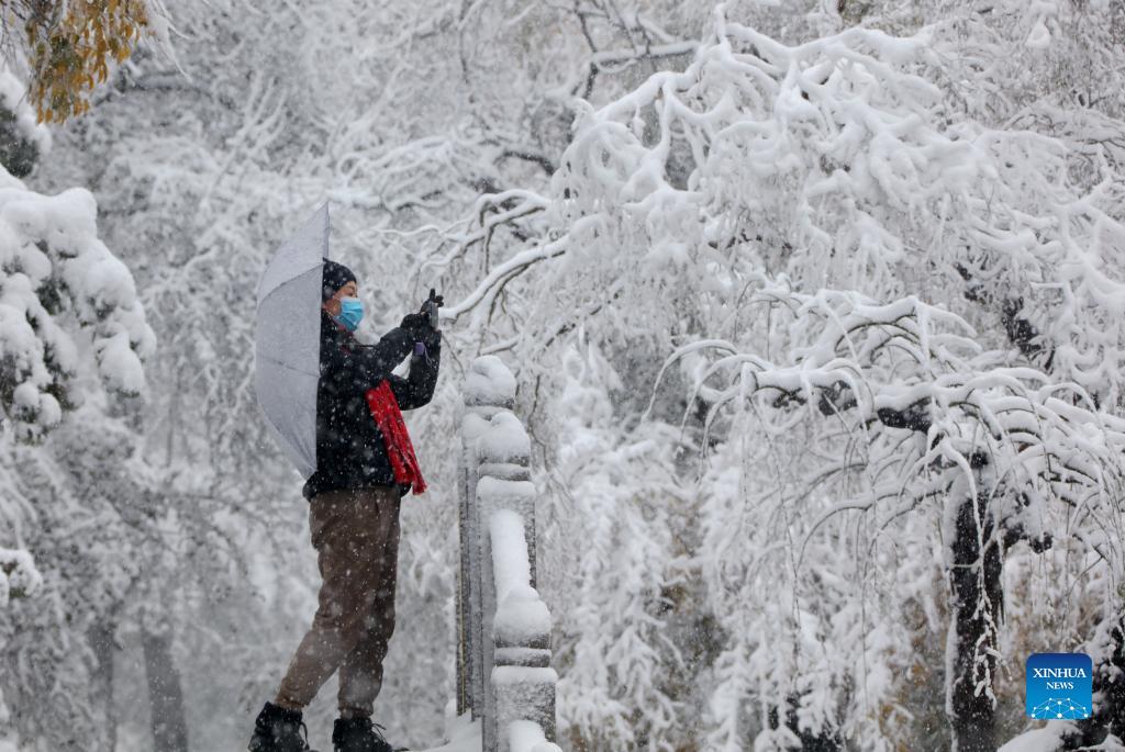 A citizen takes photos amid snow at Renmin Park in Liaocheng City, east China's Shandong Province, Nov. 7, 2021. The traditional solar term of Lidong, the beginning of winter, fell on Nov. 7 this year. (Photo by Zhu Yudong/Xinhua)