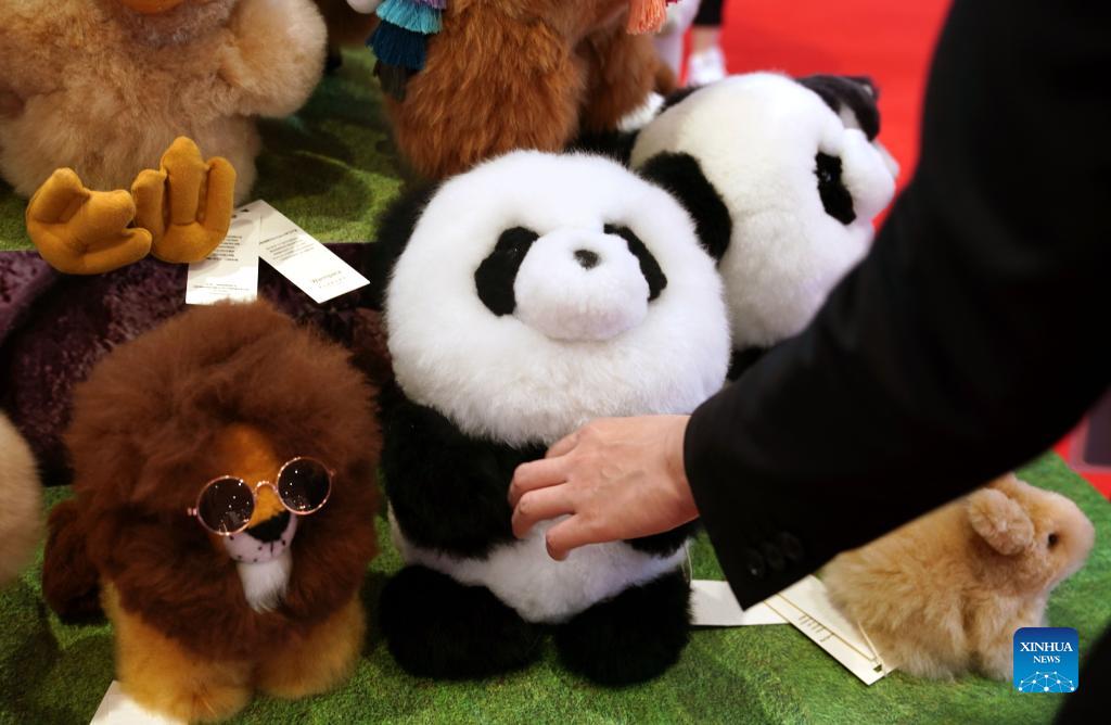 Photo taken on Nov. 6, 2021 shows alpaca-fur stuffed toys displayed at Ma Yuxia's booth during the 4th China International Import Expo (CIIE) in east China's Shanghai. At the first CIIE, Ma Yuxia, who had worked in South America after graduating from university, introduced the plush alpaca-fur stuffed toys made by Peruvian craftsmen into the Chinese market. Ma and her Peruvian business partner rented a booth of merely nine square meters at the first CIIE to display and promote these toys. Their alpaca dolls were quickly sold out, encouraging Ma and her Peruvian business partner to set up their own brand "Warmpaca." Their brand has now entered shopping malls in many Chinese cities such as Beijing, Shanghai, Guangzhou and Chengdu, and has forged cooperation with three family workshops of about 60 artisans in Peru. At the 4th CIIE, Ma's booth expanded fourfold. Having participated in the CIIE for four consecutive years, Ma and her business partner gained access to the Chinese market with these cute little "alpacas" and other traditional hand-made fluffy dolls. (Xinhua/Liu Ying)