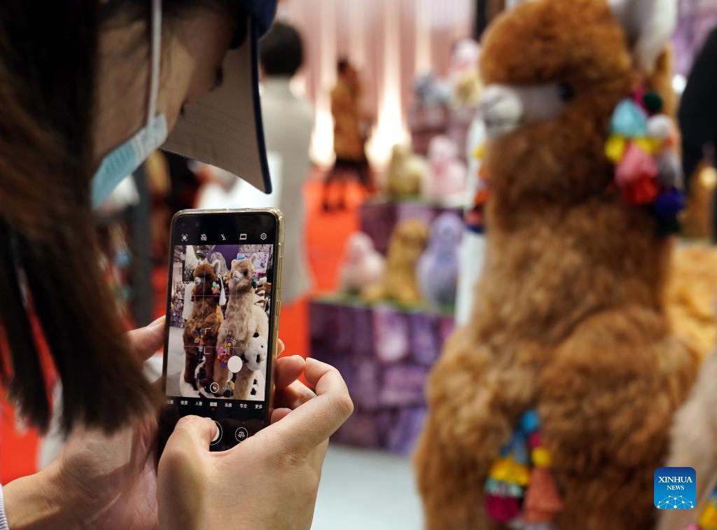 A visitor takes photos of alpaca-fur stuffed toys displayed at Ma Yuxia's booth during the 4th China International Import Expo (CIIE) in east China's Shanghai, Nov. 6, 2021. At the first CIIE, Ma Yuxia, who had worked in South America after graduating from university, introduced the plush alpaca-fur stuffed toys made by Peruvian craftsmen into the Chinese market. Ma and her Peruvian business partner rented a booth of merely nine square meters at the first CIIE to display and promote these toys. Their alpaca dolls were quickly sold out, encouraging Ma and her Peruvian business partner to set up their own brand "Warmpaca." Their brand has now entered shopping malls in many Chinese cities such as Beijing, Shanghai, Guangzhou and Chengdu, and has forged cooperation with three family workshops of about 60 artisans in Peru. At the 4th CIIE, Ma's booth expanded fourfold. Having participated in the CIIE for four consecutive years, Ma and her business partner gained access to the Chinese market with these cute little "alpacas" and other traditional hand-made fluffy dolls. (Xinhua/Liu Ying)