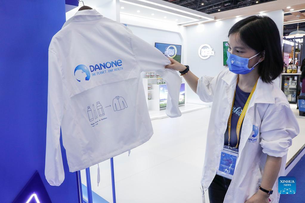 A staff member shows a coat made by recycled bottles at the Food and Agricultural Products Exhibition Area of the 4th China International Import Expo (CIIE) in east China's Shanghai, Nov. 6, 2021. The intelligent plastic bottle recycling machine at Danone booth can recycle plastic bottles thrown away by visitors and turns them into soft fabrics. Fabrics made from 16 bottles can make a coat. (Xinhua/Zhang Yuwei)