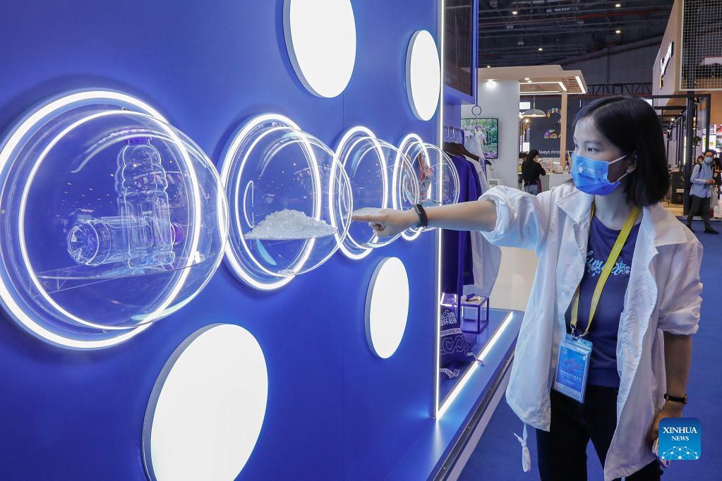 A staff member introduces the steps to recycle plastic bottles at the Food and Agricultural Products Exhibition Area of the 4th China International Import Expo (CIIE) in east China's Shanghai, Nov. 6, 2021. The intelligent plastic bottle recycling machine at Danone booth can recycle plastic bottles thrown away by visitors and turns them into soft fabrics. Fabrics made from 16 bottles can make a coat. (Xinhua/Zhang Yuwei)