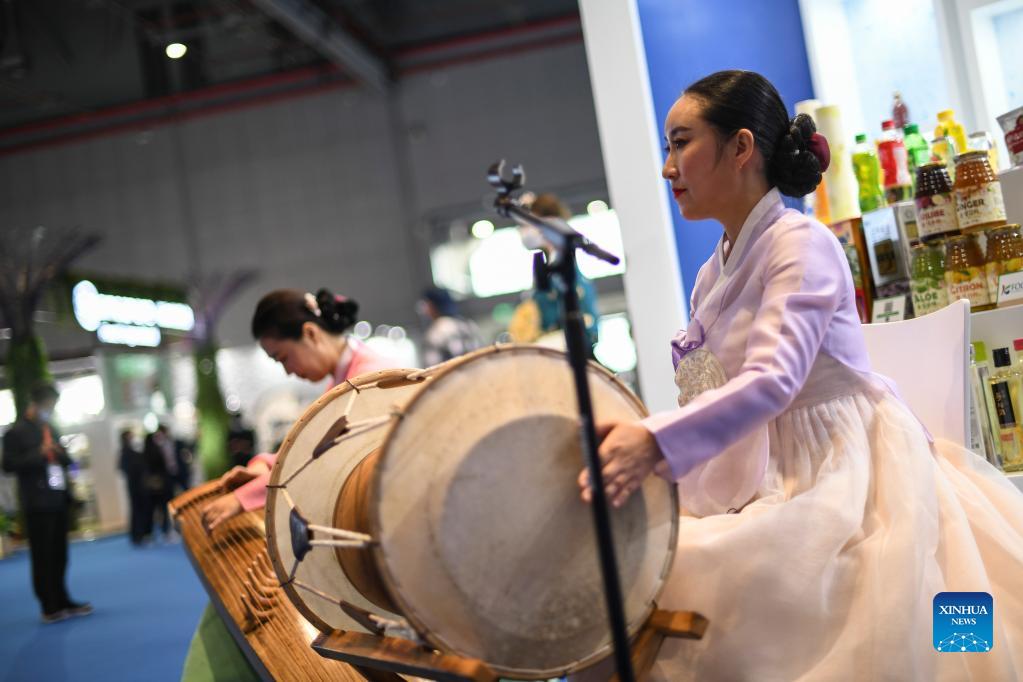 Staff members perform at the 4th China International Import Expo (CIIE) in east China's Shanghai, Nov. 6, 2021. (Xinhua/Zhang Haofu)