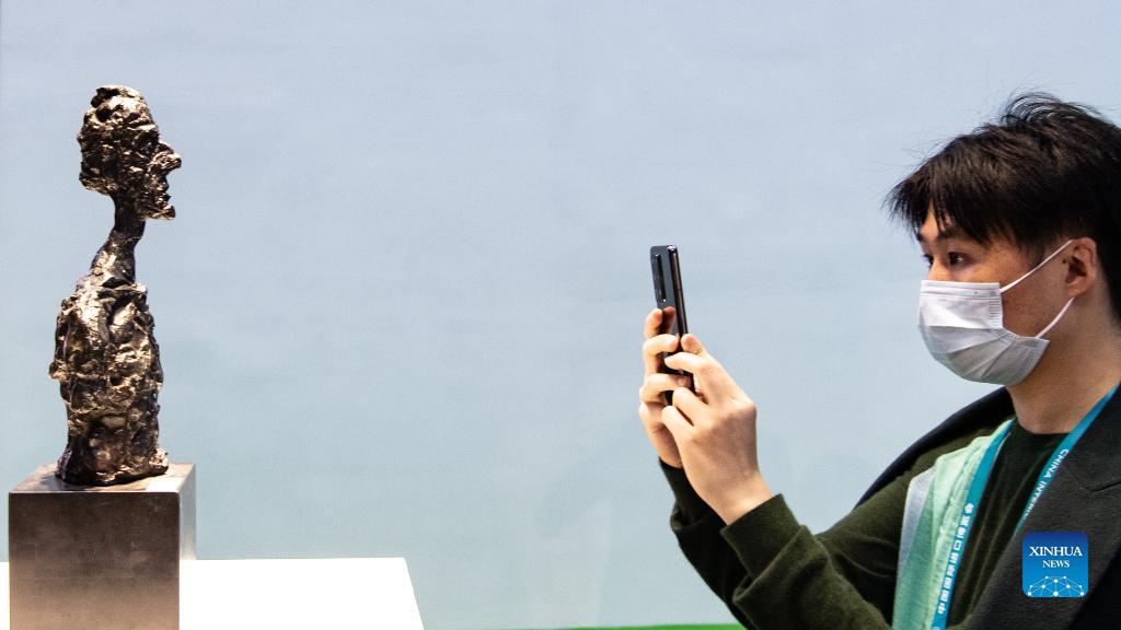 A visitor takes photo of an artwork during the 4th China International Import Expo (CIIE) in east China's Shanghai, Nov. 7, 2021. The China International Import Expo (CIIE) has for the first time established a cultural relics and art section. Major auction houses made their debuts at the fourth iteration of the expo in the hope of attracting Chinese collectors. The special section has an exhibition area of more than 1,200 square meters and hosts 178 exhibits with a total estimated value of 2.35 billion yuan (about 367 million U.S. dollars). (Xinhua/Wu Huiwo)