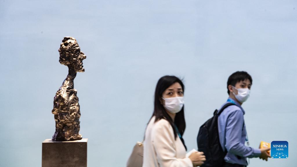 Visitors walk by an artwork during the 4th China International Import Expo (CIIE) in east China's Shanghai, Nov. 7, 2021. The China International Import Expo (CIIE) has for the first time established a cultural relics and art section. Major auction houses made their debuts at the fourth iteration of the expo in the hope of attracting Chinese collectors. The special section has an exhibition area of more than 1,200 square meters and hosts 178 exhibits with a total estimated value of 2.35 billion yuan (about 367 million U.S. dollars). (Xinhua/Wu Huiwo)