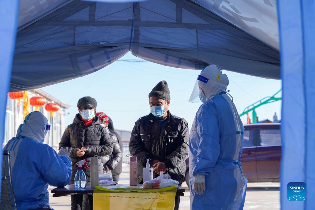 Residents queue for nucleic acid testing in Henantun Village of Xingfu Town in Heihe, northeast China's Heilongjiang Province, Nov. 7, 2021. (Xinhua/Wang Song)
