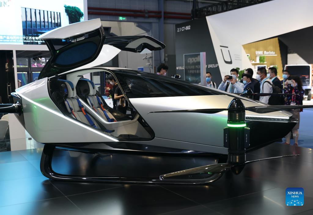 Photo taken on Nov. 7, 2021 shows an Xpeng flying vehicle displayed at the Automobile Exhibition Area of the 4th China International Import Expo (CIIE) in east China's Shanghai. (Xinhua/Hou Dongtao)