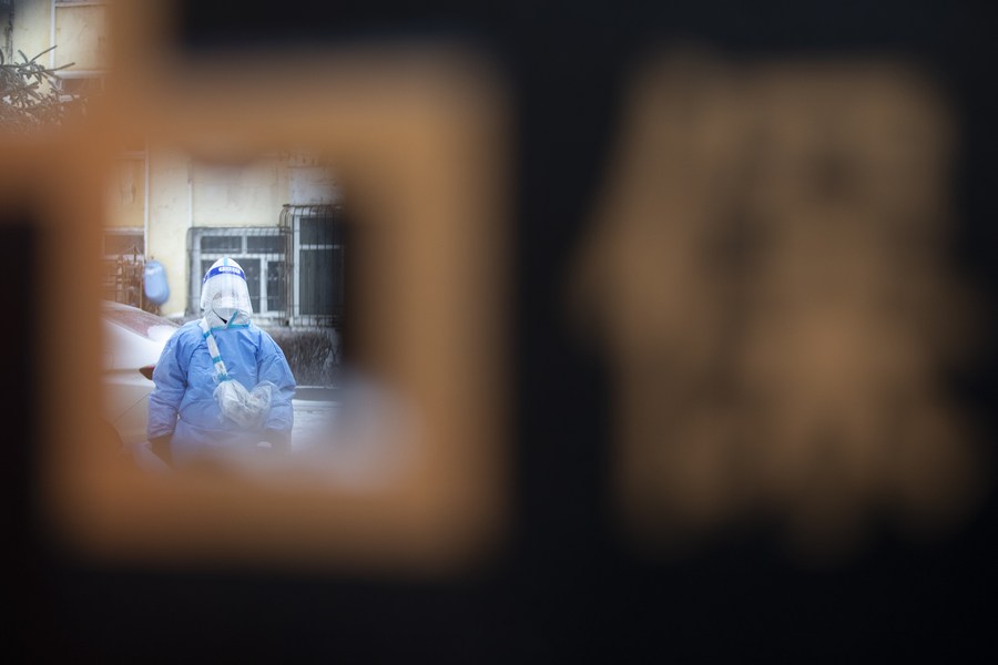 A staff member stands guard at a check point in Pingfang District, Harbin, northeast China's Heilongjiang Province, Nov. 8, 2021. (Xinhua/Zhang Tao)