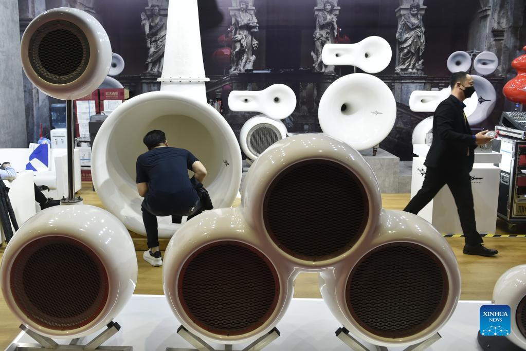 People learns about audio equipment at the booth of Pequod Acoustics during the 4th China International Import Expo (CIIE) in east China's Shanghai, Nov. 6, 2021. Pequod Acoustics takes part in the CIIE for the first time. The 4th CIIE kicked off on Nov. 5 and will last till Nov. 10, attracting over 3,000 businesses from 127 countries and regions. (Xinhua/Lu Peng)