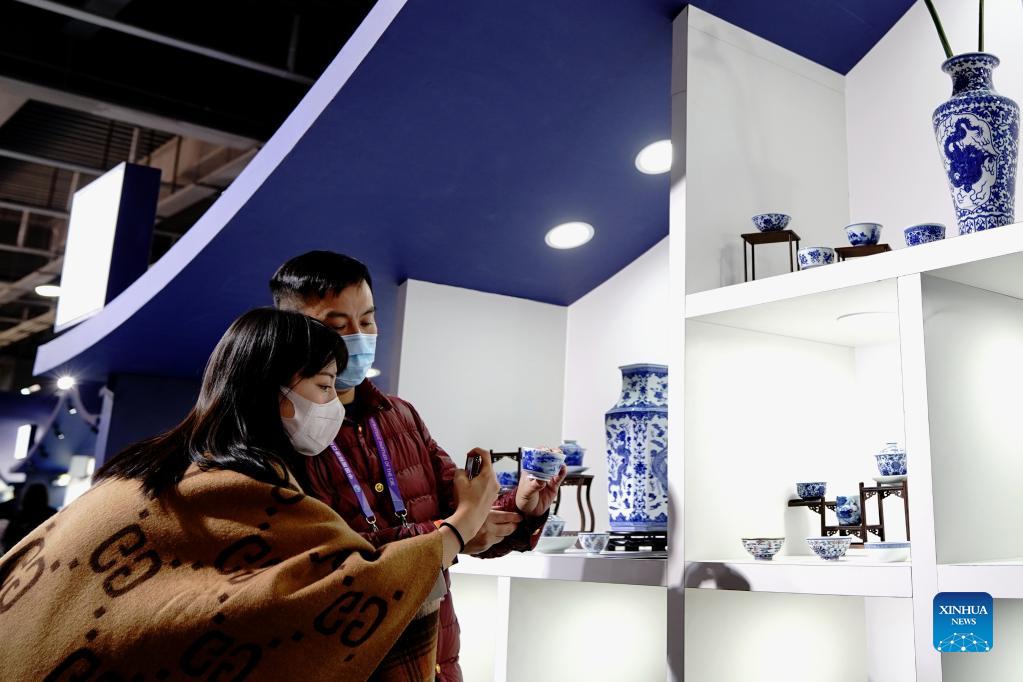 People look at porcelain products from east China's Jiangxi Province while visiting the China International Import Expo (CIIE) at the National Exhibition and Convention Center (Shanghai) in Shanghai, east China, Nov. 8, 2021. The ongoing 4th China International Import Expo (CIIE) is held in Shanghai from Nov. 5 to Nov. 10. (Xinhua/Zhang Jiansong)