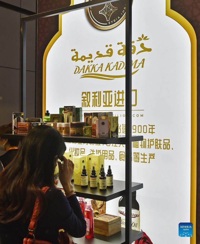 A visitor looks at Syrian essential oil products during the 4th China International Import Expo (CIIE) in east China's Shanghai, Nov. 6, 2021. (Xinhua/Lu Peng)