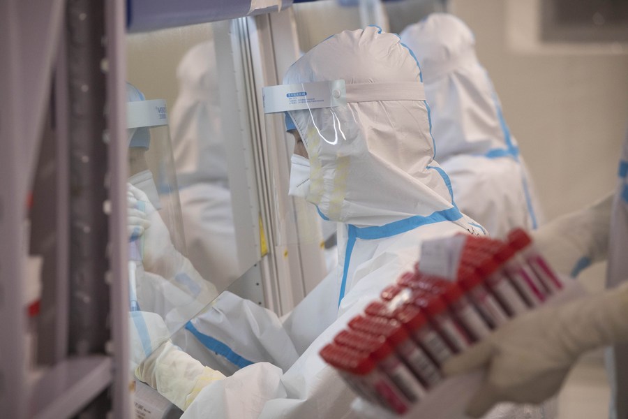 Medical workers work at a mobile laboratory for nucleic acid test in Harbin, northeast China's Heilongjiang Province, Nov. 5, 2021. (Xinhua/Zhang Tao)