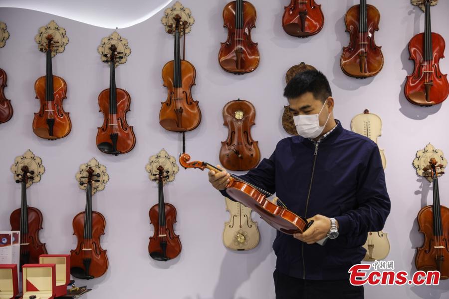 Violins on display at Shenyang Time-honored Brand Musical Instrument Factory attract visitors at the 4th CIIE, National Exhibition and Convention Center (Shanghai), Nov. 8, 2021. (Photo: China News Service/Zhang Hengwei)