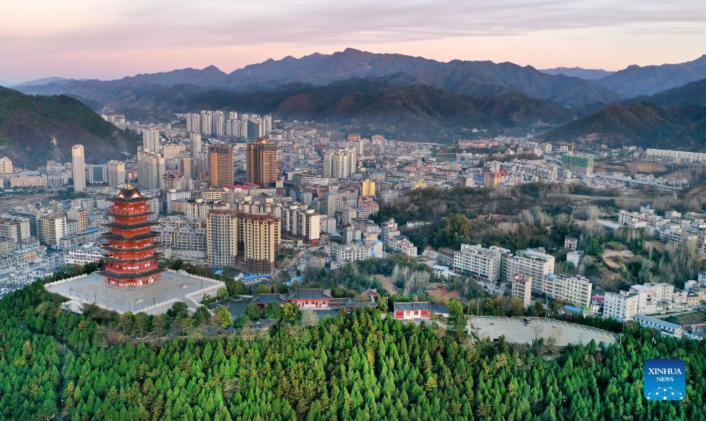 Aerial photo taken on Nov. 9, 2021 shows a view of Shangnan County, a remote town tucked in the Qinling Mountains, in northwest China's Shaanxi Province. (Xinhua/Tao Ming)