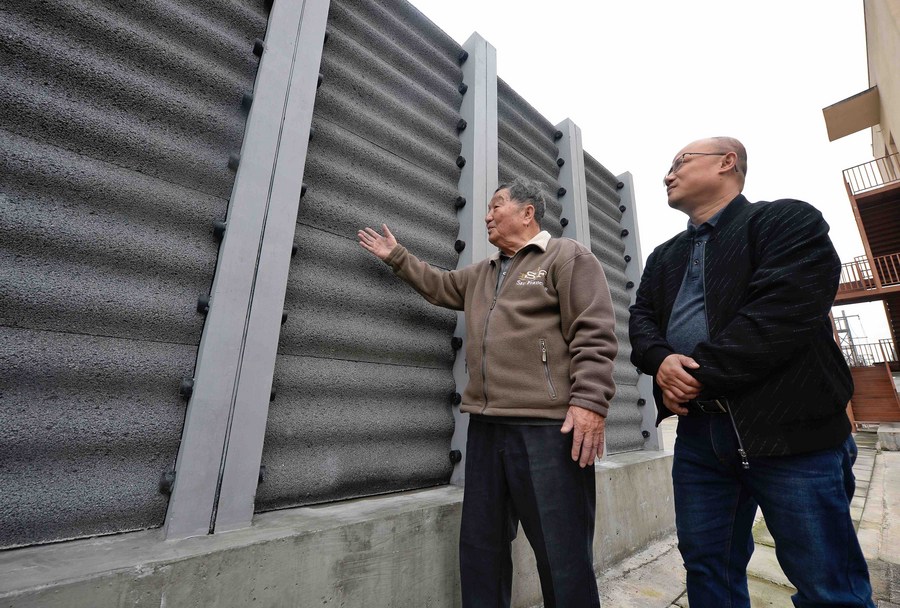 Wang Qichang (L) talks as he touches the concrete sound barrier for high-speed railway in Chengdu, southwest China's Sichuan Province, Nov. 4, 2021.(Xinhua/Liu Kun)