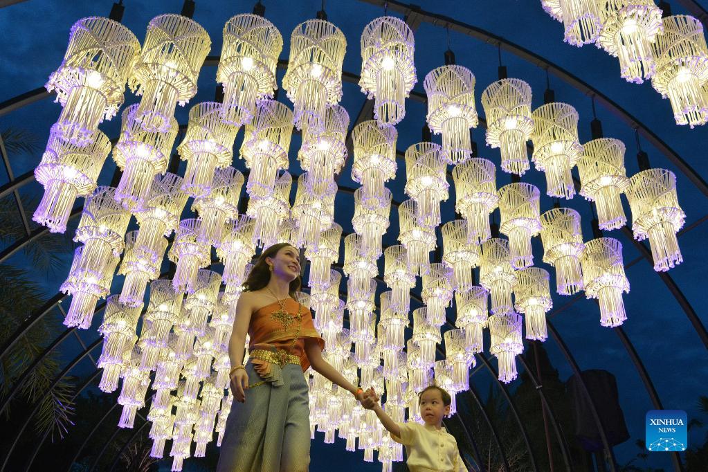 People visit a pre-show of the Thailand International Lantern and Food Festival at Muangboran, Samut Prakan Province, Thailand, on Nov. 8, 2021. The festival will be held from Nov. 12 to Dec. 6. (Xinhua/Rachen Sageamsak)