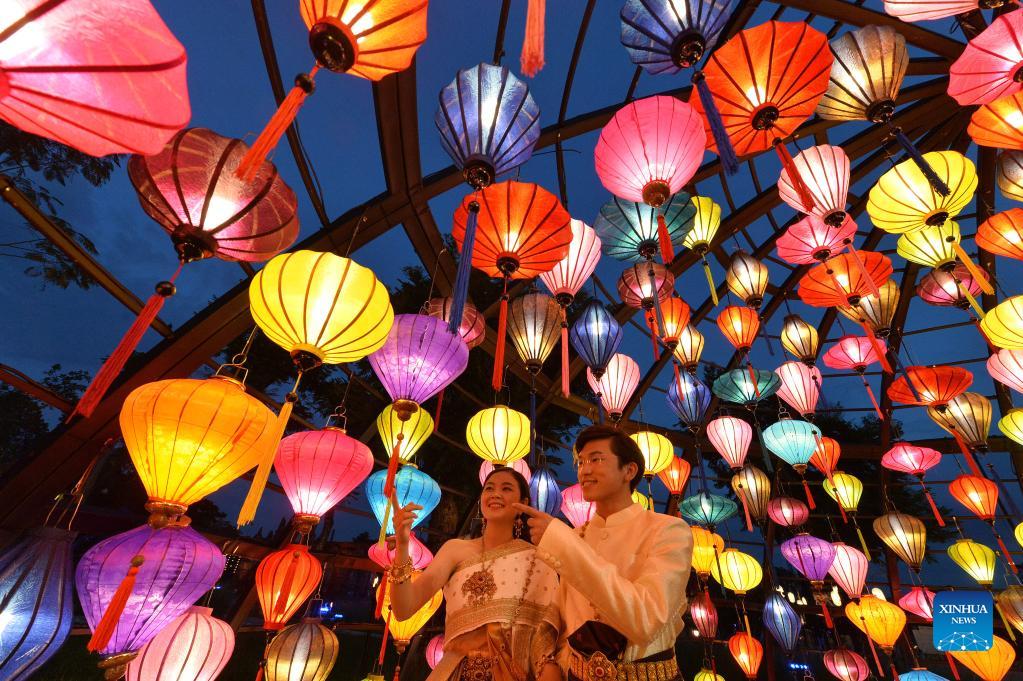 People visit a pre-show of the Thailand International Lantern and Food Festival at Muangboran, Samut Prakan Province, Thailand, on Nov. 8, 2021. The festival will be held from Nov. 12 to Dec. 6. (Xinhua/Rachen Sageamsak)