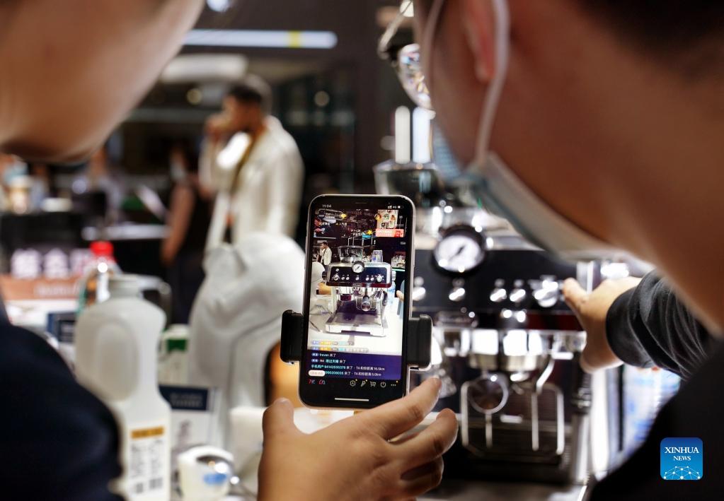 Staff members promote coffee machines via livestreaming at the Consumer Goods Exhibition Area of the 4th China International Import Expo (CIIE) in east China's Shanghai, Nov. 9, 2021. Lots of exhibitors at the 4th CIIE resort to livestreaming promotion at their booths to attract on-line buyers for items displayed on-site. (Xinhua/Liu Ying)