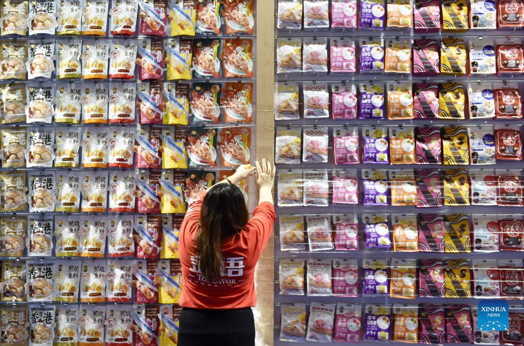 An exhibitor sorts out exhibits at the 4th China International Import Expo (CIIE) in east China's Shanghai, Nov. 6, 2021. The 4th CIIE kicked off on Nov. 5 and will last till Nov. 10, attracting over 3,000 businesses from 127 countries and regions. (Xinhua/Lu Peng)