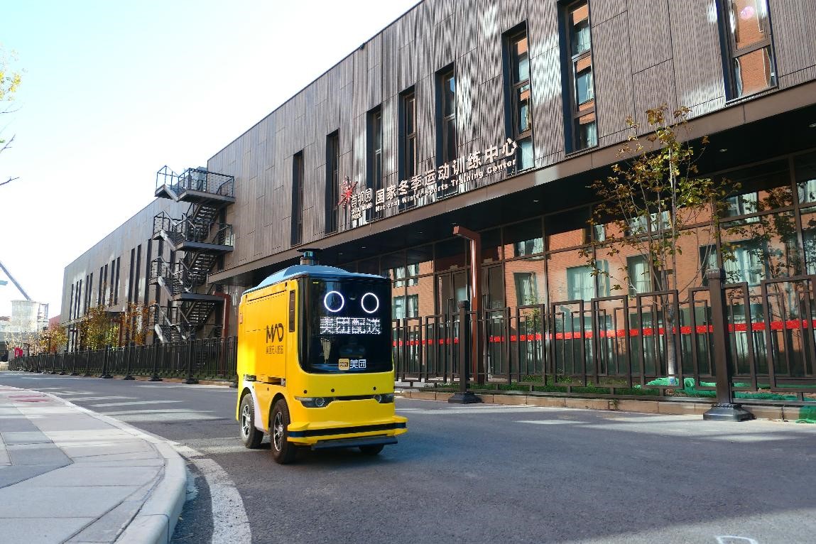 An unmanned delivery vehicle of Chinese online service-focused e-commerce giant Meituan delivers parcels at Shougang Industrial Park in Beijing, Nov. 1, 2020. (People’s Daily Online/He Luqi)