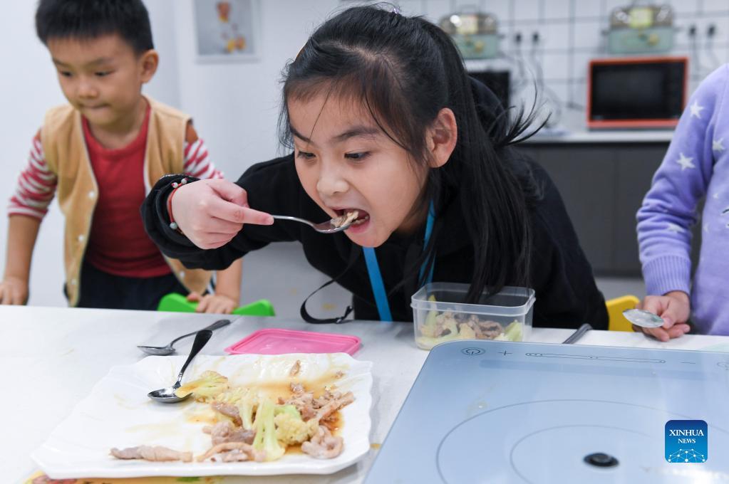 A girl tastes the dish cooked by her team during the cooking course at the Little Chef training center in Xishan Primary School in Shunde District of Foshan City, south China's Guangdong Province, Nov. 9, 2021. Xishan Primary School in Shunde has set up a Little Chef training center since September this year on its school campus in cooperation with Shunde Fengchu Vocational Skills Training School, providing students with a cooking class of 45 minutes after school every day. Professional cooking instructors, together with school teachers, give cooking lessons suitable for different ages at the training center. In the class, pupils can learn and practice the cooking of Chinese and Western cuisine, including making some easy-to-learn local Shunde specialties. Through the cooking course, pupils may learn about different food materials, understand how to prepare them, as well as build basic culinary skills and savor the dishes cooked by themselves. The course is open to students in all grades of school. There is one class provided each day and each class is attended by 60 students. The Little Chef cooking course has been well received by students and their parents since its launch. (Xinhua/Mao Siqian)