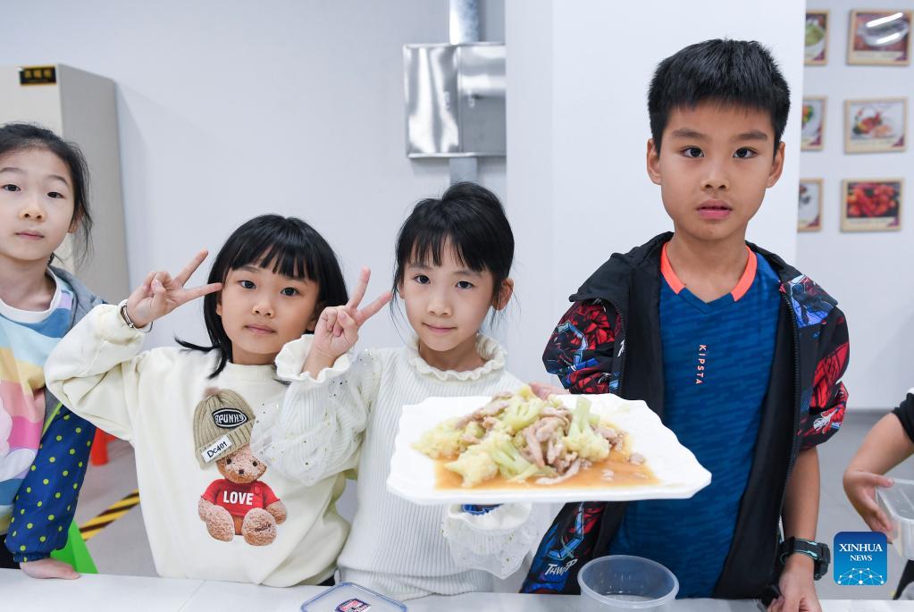 Pupils display the dish cooked by themselves at the Little Chef training center in Xishan Primary School in Shunde District of Foshan City, south China's Guangdong Province, Nov. 9, 2021. Xishan Primary School in Shunde has set up a Little Chef training center since September this year on its school campus in cooperation with Shunde Fengchu Vocational Skills Training School, providing students with a cooking class of 45 minutes after school every day. Professional cooking instructors, together with school teachers, give cooking lessons suitable for different ages at the training center. In the class, pupils can learn and practice the cooking of Chinese and Western cuisine, including making some easy-to-learn local Shunde specialties. Through the cooking course, pupils may learn about different food materials, understand how to prepare them, as well as build basic culinary skills and savor the dishes cooked by themselves. The course is open to students in all grades of school. There is one class provided each day and each class is attended by 60 students. The Little Chef cooking course has been well received by students and their parents since its launch. (Xinhua/Mao Siqian)
