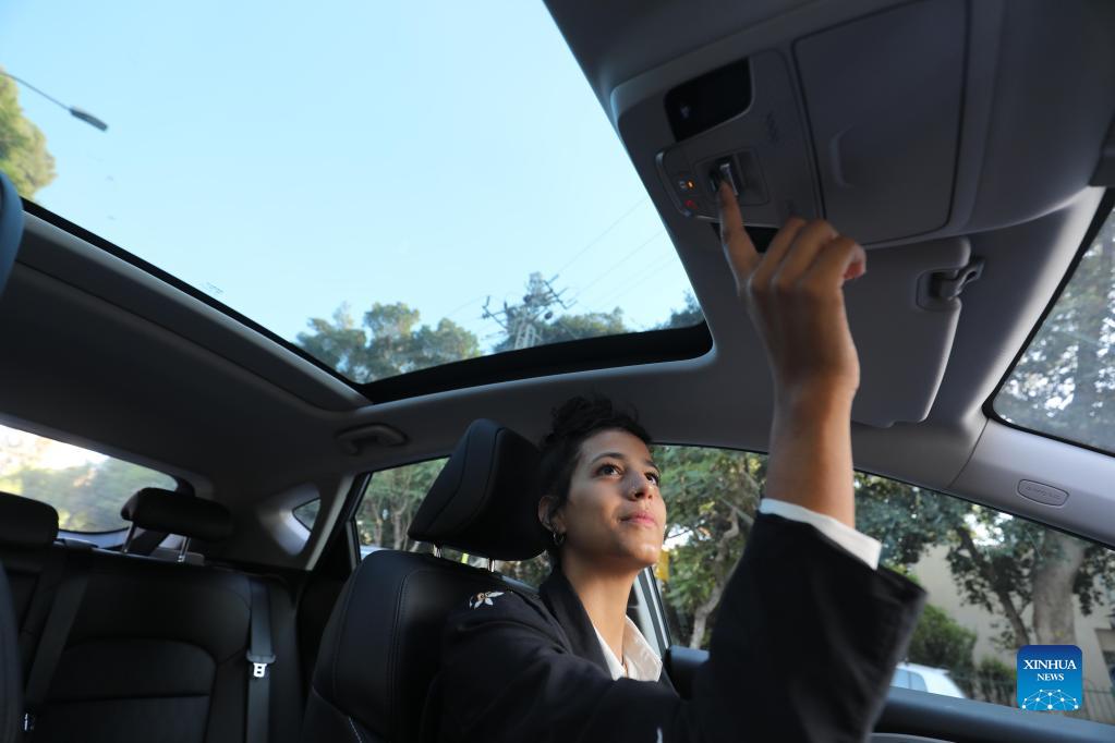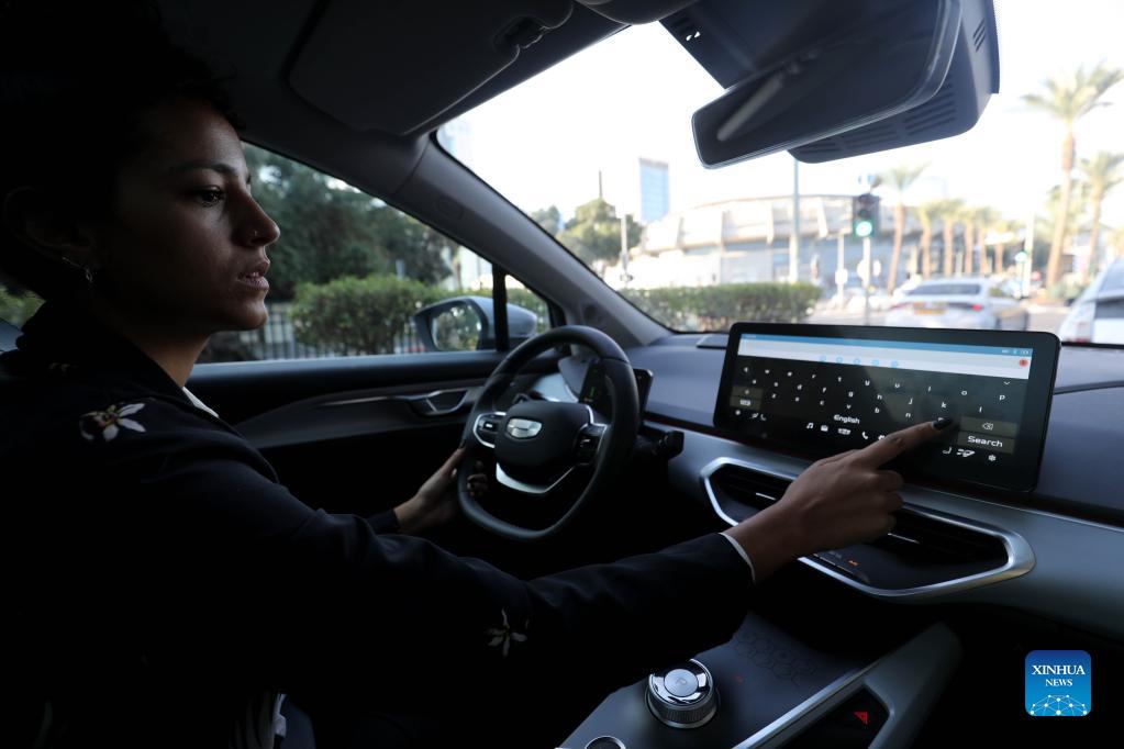 A staff member shows an electric car made by China's Geely Auto in Tel Aviv, Israel, on Nov. 10, 2021. Chinese automaker Geely Auto Group has started selling electric cars in Israel through the Israeli dealership Union Group. (Photo by Gil Cohen Magen/Xinhua)