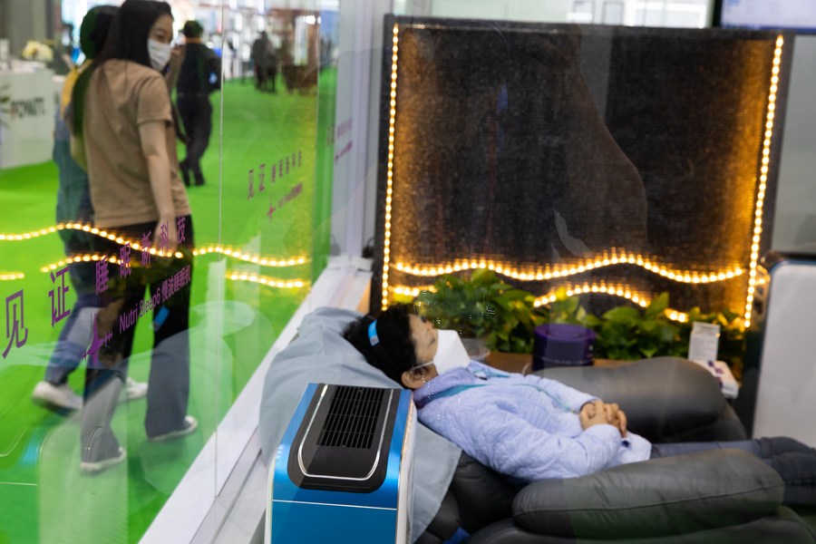A visitor experiences a product designed for better sleep at the Medical Equipment &Health Care Products Exhibition Area of the 4th China International Import Expo (CIIE) in east China's Shanghai, Nov. 5, 2021. (Xinhua/Jin Liwang)
