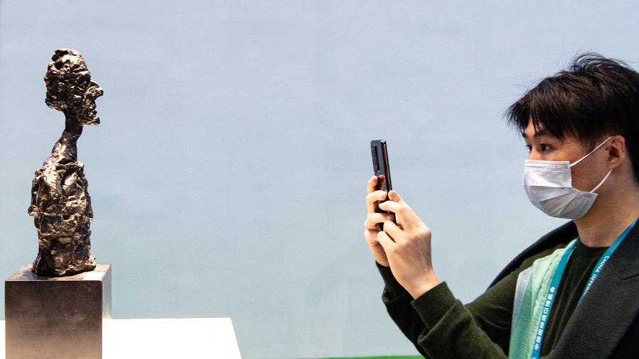A visitor takes photo of an artwork during the 4th China International Import Expo (CIIE) in east China's Shanghai, Nov. 7, 2021. (Xinhua/Wu Huiwo)