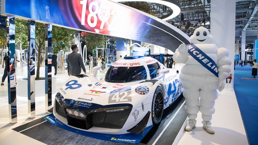 Photo taken on Nov. 7, 2021 shows a Mission H24 hydrogen racing car displayed at Michelin booth of the Automobile Exhibition Area of the 4th China International Import Expo (CIIE) in east China's Shanghai. (Xinhua/Meng Tao)