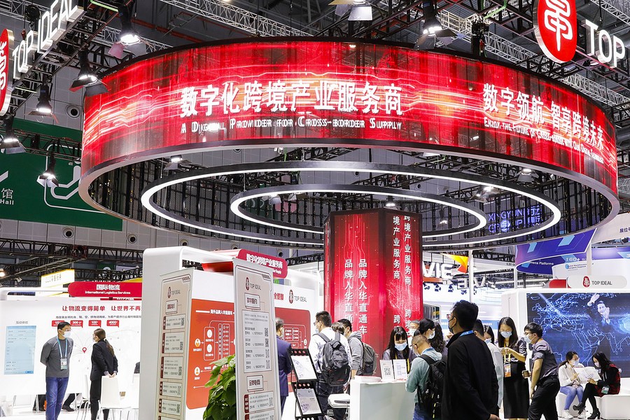 Photo taken on Nov. 7, 2021 shows the booth of digital provider for cross-border supply at the Trade in Services Exhibition Area of the 4th China International Import Expo (CIIE) in east China's Shanghai. (Xinhua/Zhang Yuwei)