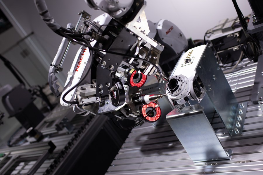 Photo taken on Nov. 7, 2021 shows a robot arm equipped with compound eye imaging system at the Intelligent Industry &Information Technology Exhibition Area of the 4th China International Import Expo (CIIE) in east China's Shanghai. (Xinhua/Jin Liwang)