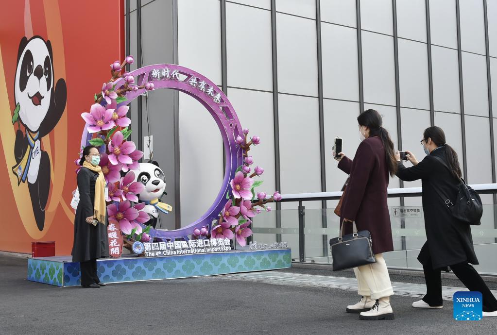 Visitors take photos with a poster at the 4th China International Import Expo (CIIE), in east China's Shanghai, Nov. 10, 2021. The 4th CIIE concluded here on Wednesday. (Xinhua/Lu Peng)