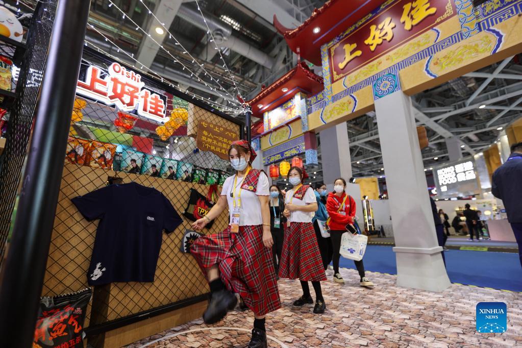 An exhibitor demonstrates an interactive game at the Food and Agricultural Products Exhibition Area of the 4th China International Import Expo (CIIE) in east China's Shanghai, Nov. 6, 2021. The 4th CIIE concluded here on Wednesday. (Xinhua/Wang Xiang)