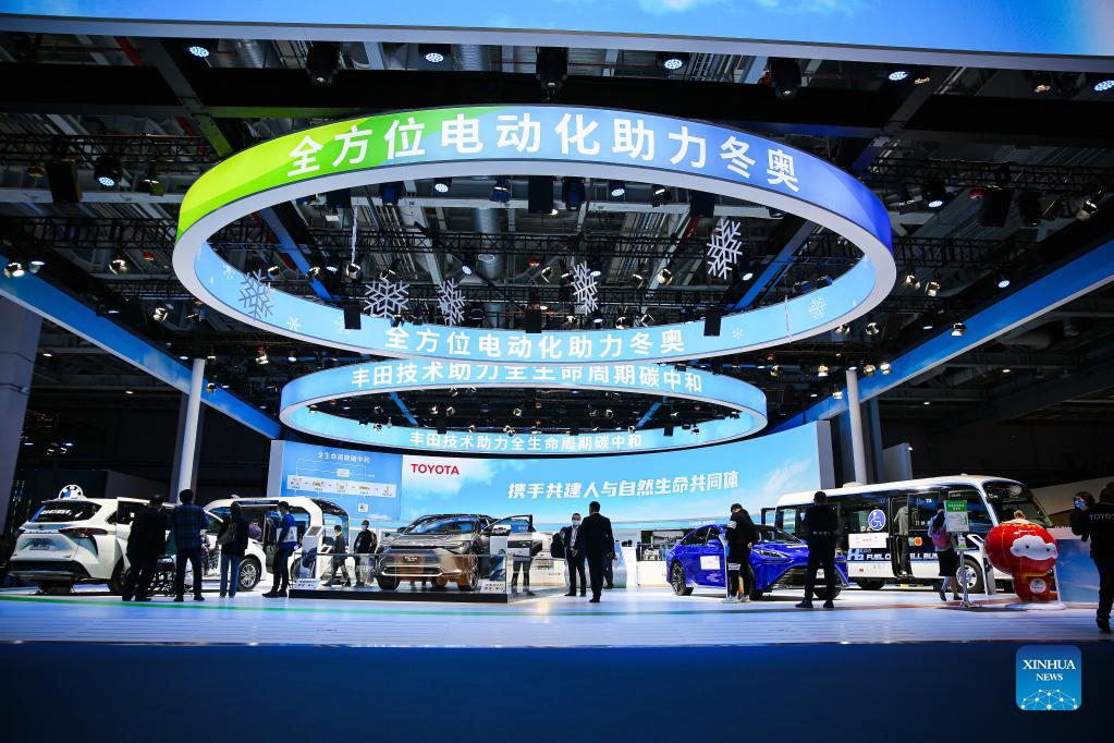 Photo taken on Nov. 5, 2021 shows a booth decorated with elements of the Beijing 2022 Olympic Winter Games at the Automobile Exhibition Area of the 4th China International Import Expo (CIIE) in east China's Shanghai. The 4th CIIE concluded here on Wednesday. (Photo by Hao Zhao/Xinhua)