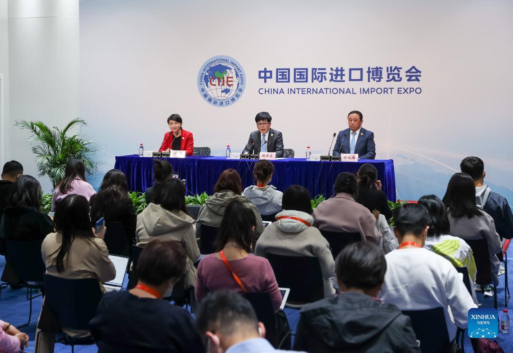 A press conference of the 4th China International Import Expo (CIIE) is held in east China's Shanghai, Nov. 10, 2021. A total of 70.72 billion U.S. dollars worth of tentative deals were reached for one-year purchases of goods and services at the 4th CIIE, which concluded on Wednesday, Sun Chenghai, deputy director of the CIIE Bureau, told a press conference. (Xinhua/Wang Xiang)