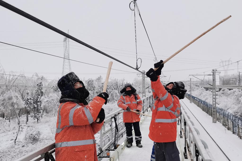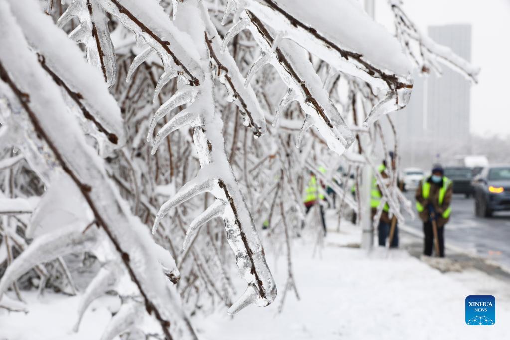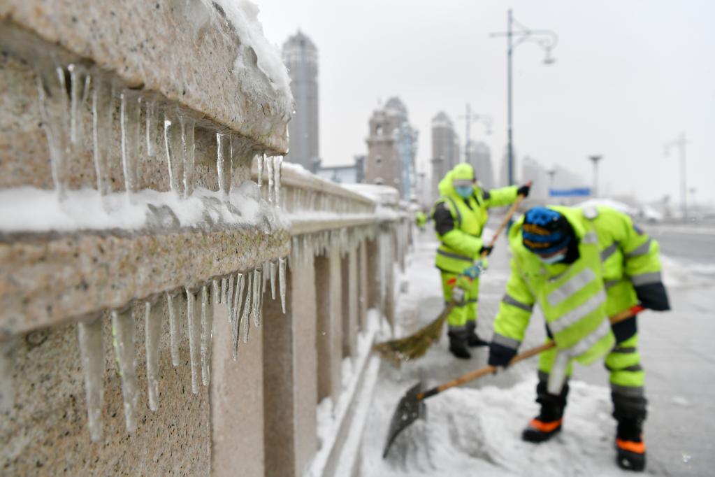 Workers of the China Railway Harbin Bureau Group clear ice in Harbin, northeast China's Heilongjiang Province, Nov. 10, 2021. Faced with the recent cold weather and snowstorms, the local authorities of Harbin have launched an emergency response program to ensure power, gas and heat supply, guaranteeing people's normal life. (Xinhua)