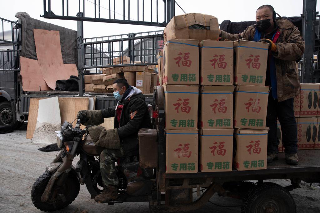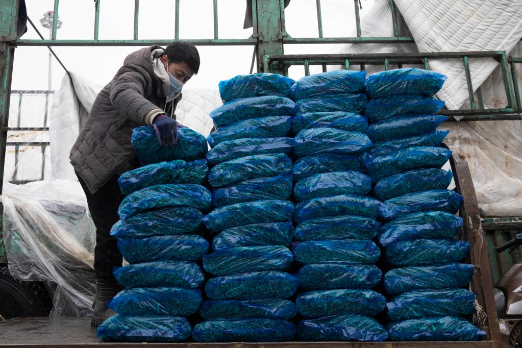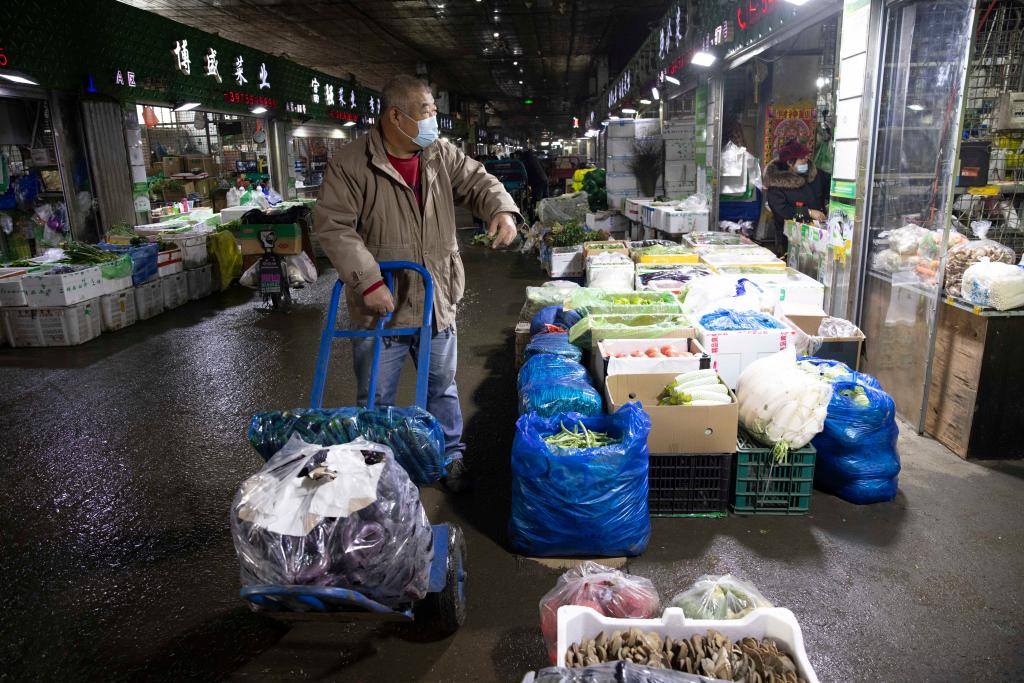 A worker loads vegetables at a market in Harbin, northeast China's Heilongjiang Province, Nov. 10, 2021. Faced with the recent cold weather and snowstorms, the local authorities of Harbin have launched an emergency response program to ensure power, gas and heat supply, guaranteeing people's normal life. (Xinhua/Zhang Tao)