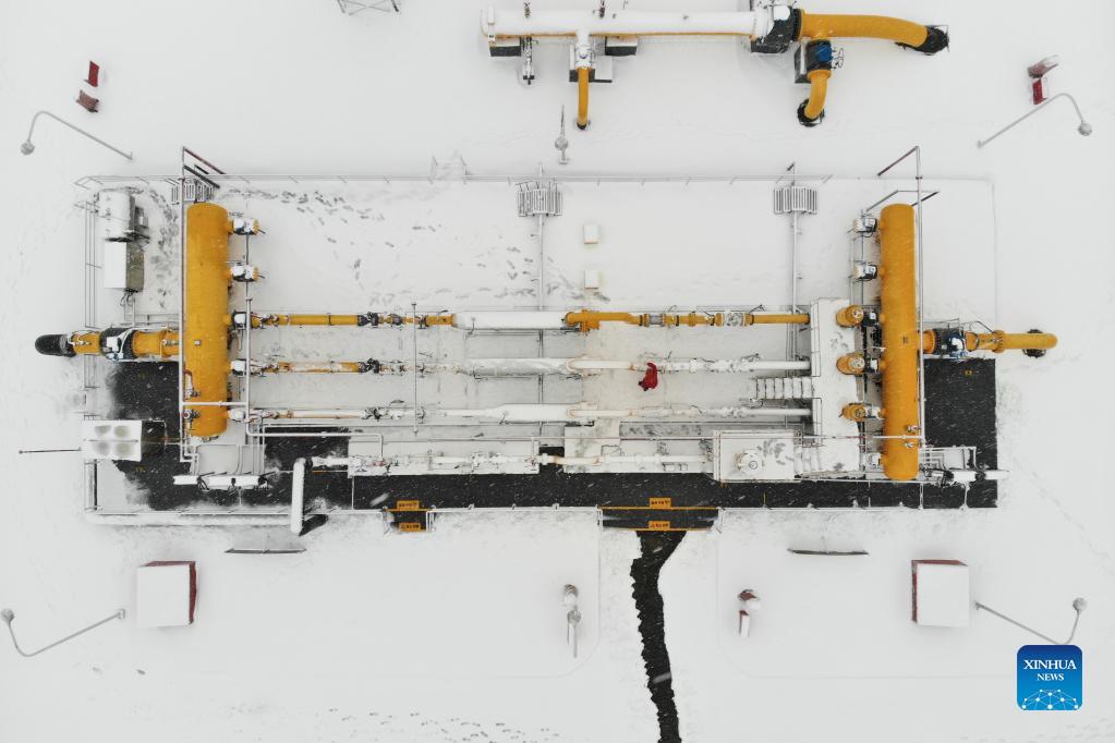 Aerial photo taken on Nov. 9, 2021 shows a maintenance worker is on duty to ensure the stable supply of gas in Harbin, northeast China's Heilongjiang Province. Faced with the recent cold weather and snowstorms, the local authorities of Harbin have launched an emergency response program to ensure power, gas and heat supply, guaranteeing people's normal life. (Xinhua/Zhang Tao)