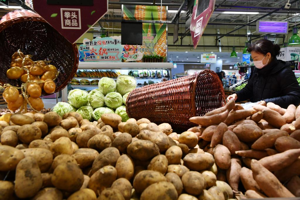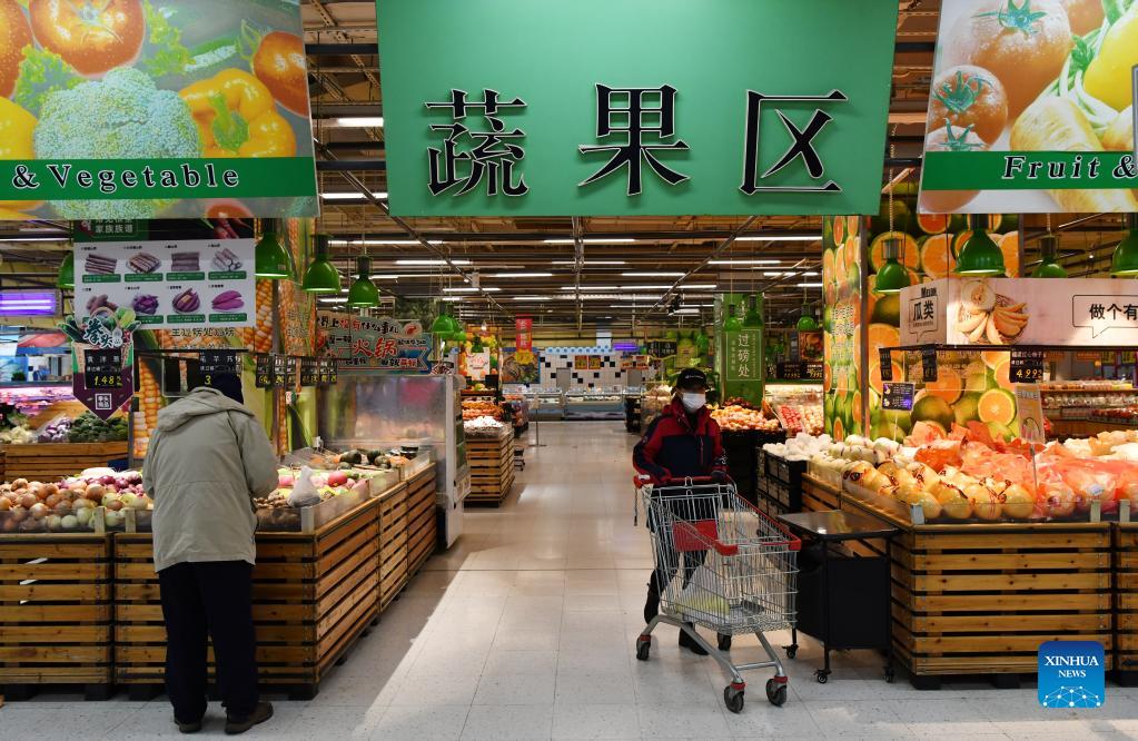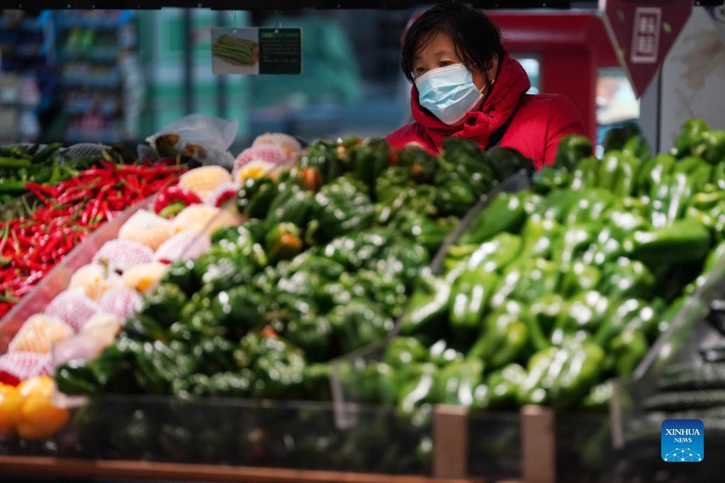 A citizen buys vegetables at a supermarket in Harbin, northeast China's Heilongjiang Province, Nov. 10, 2021. Faced with the recent cold weather and snowstorms, the local authorities of Harbin have launched an emergency response program to ensure power, gas and heat supply, guaranteeing people's normal life. (Xinhua/Wang Jianwei)
