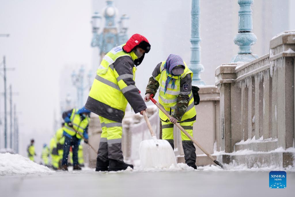 Sanitation workers clear snow on the road in Harbin, northeast China's Heilongjiang Province, Nov. 10, 2021. Faced with the recent cold weather and snowstorms, the local authorities have launched an emergency program to ensure local power, gas and heat supply, guaranteeing people's normal life. (Xinhua/Zhang Tao)