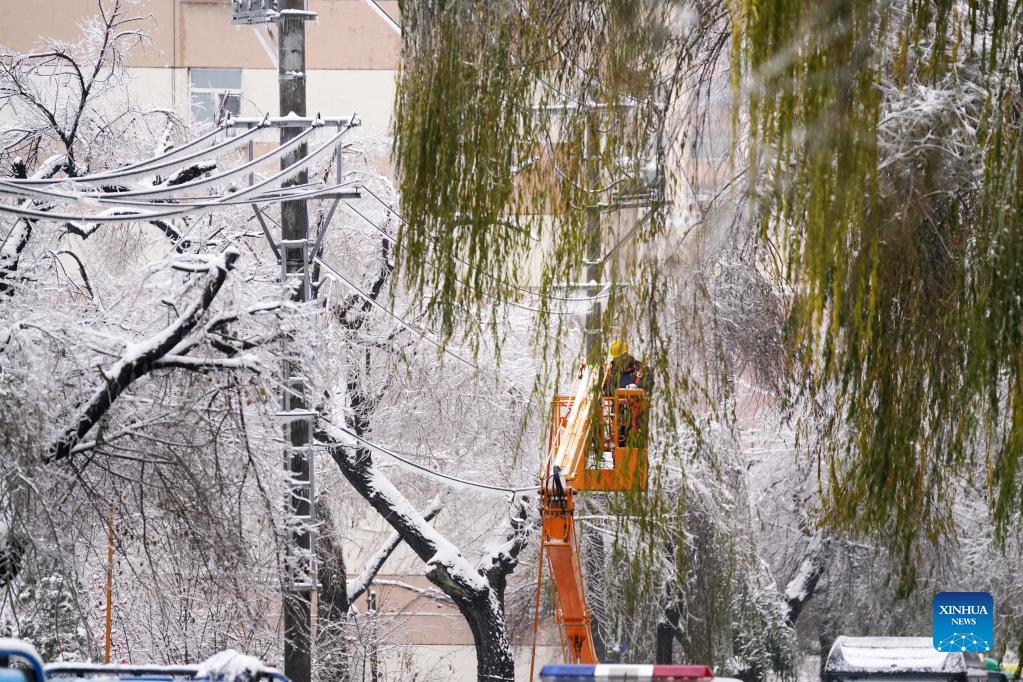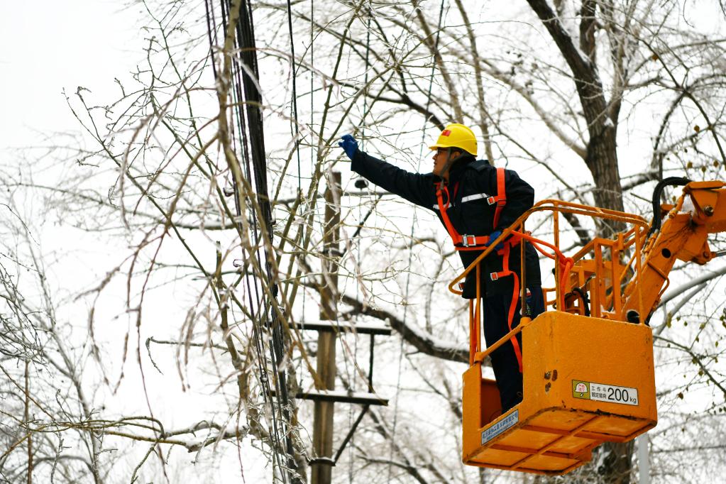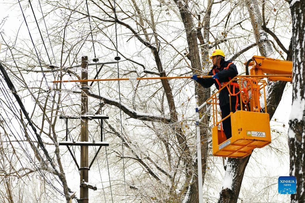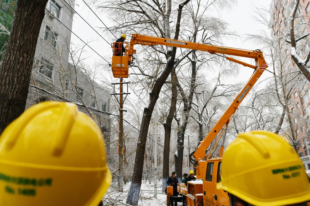 Technicians of the State Grid Harbin Electric Power Company check power transmission lines to ensure the stable power supply in Harbin, northeast China's Heilongjiang Province, Nov. 9, 2021. Faced with the recent cold weather and snowstorms, the local authorities of Harbin have launched an emergency response program to ensure power, gas and heat supply, guaranteeing people's normal life. (Xinhua/Wang Jianwei)