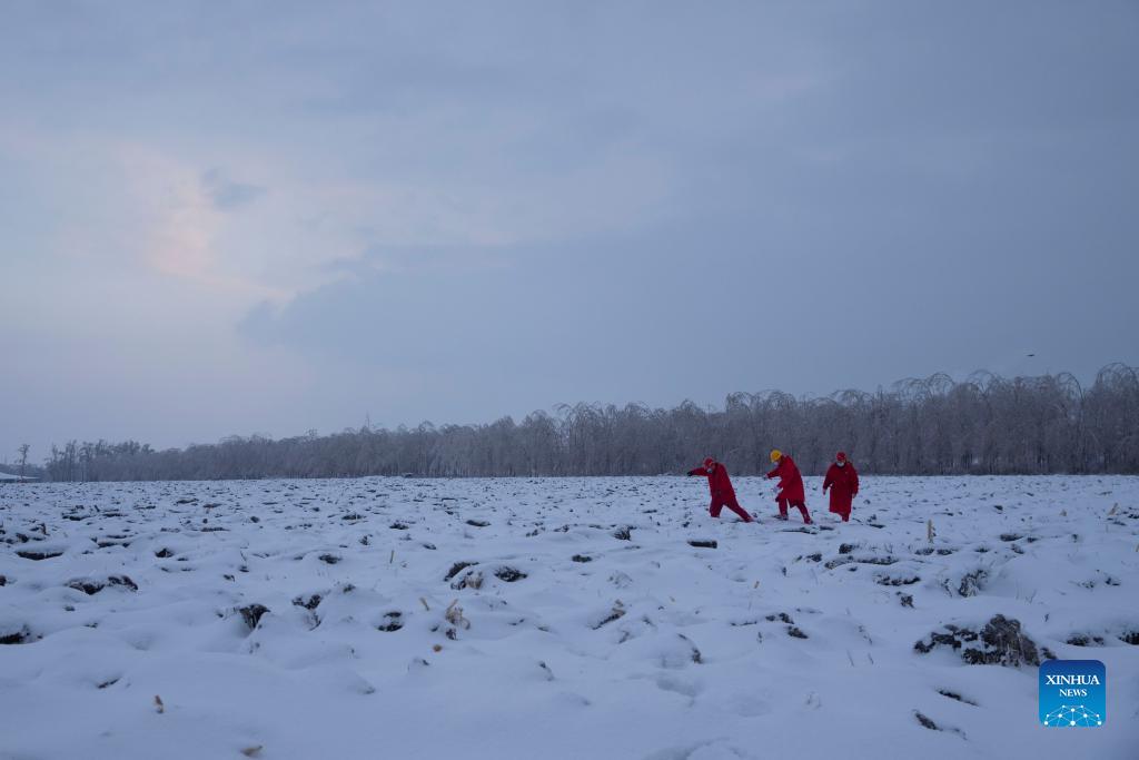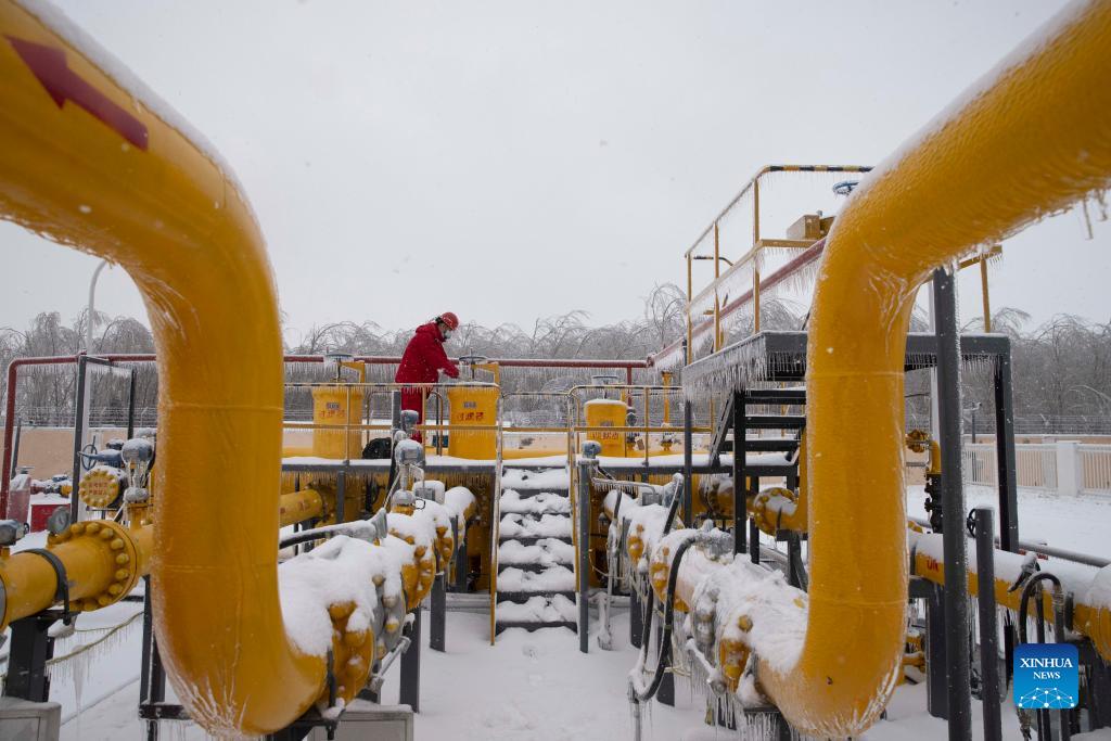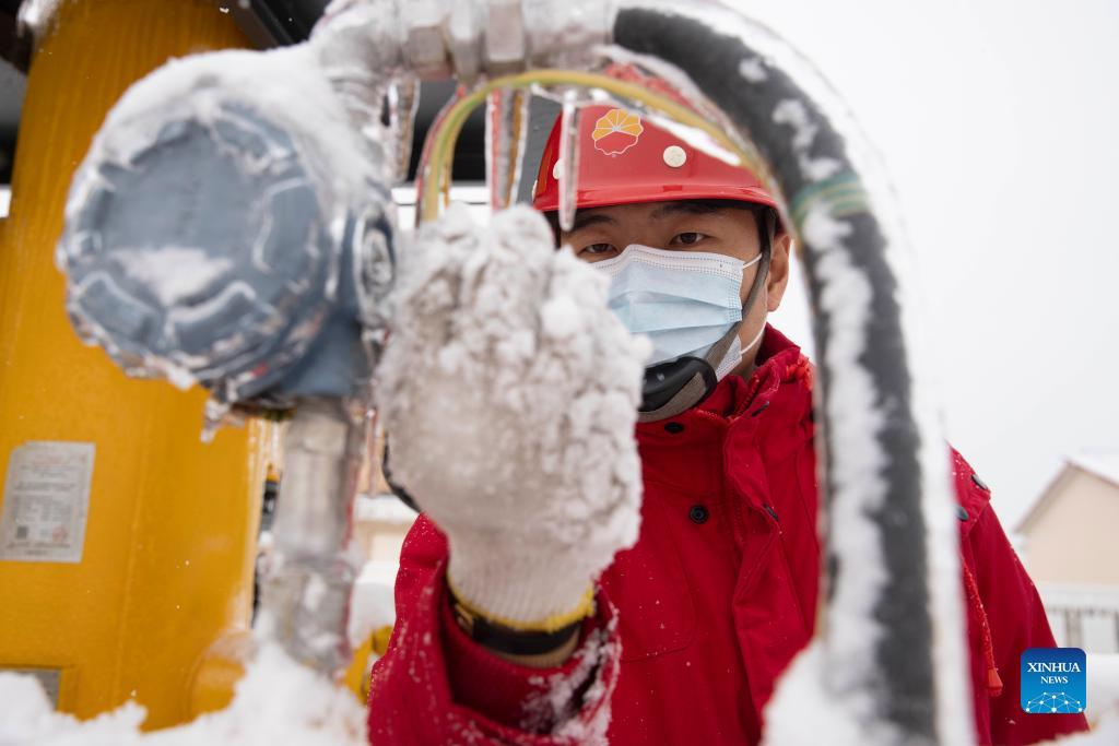 Maintenance workers of a gas company are on patrol inspection to make sure the stable operation of local gas supply in Harbin, northeast China's Heilongjiang Province, Nov. 9, 2021. Faced with the recent cold weather and snowstorms, the local authorities have launched an emergency program to ensure local power, gas and heat supply, guaranteeing people's normal life. (Xinhua/Zhang Tao)