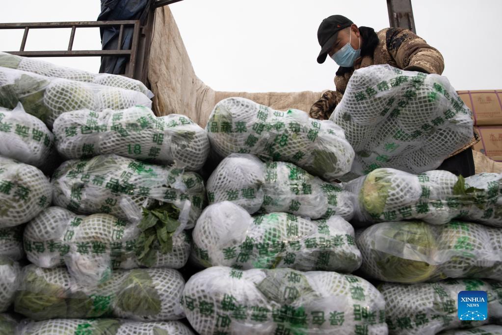 A worker loads vegetables at a market in Harbin, northeast China's Heilongjiang Province, Nov. 10, 2021. Faced with the recent cold weather and snowstorms, the local authorities have launched an emergency program to ensure local power, gas and heat supply, guaranteeing people's normal life. (Xinhua/Zhang Tao)