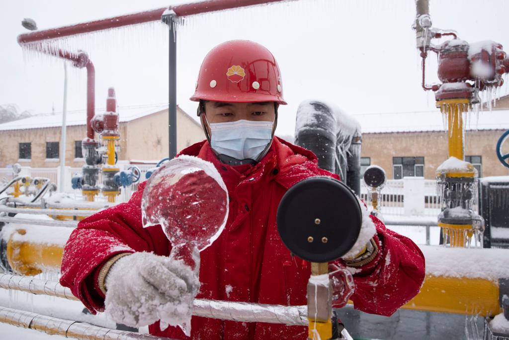A maintenance worker is on duty to ensure the stable supply of gas in Harbin, northeast China's Heilongjiang Province, Nov. 9, 2021. Faced with the recent cold weather and snowstorms, the local authorities of Harbin have launched an emergency response program to ensure power, gas and heat supply, guaranteeing people's normal life. (Xinhua/Zhang Tao)