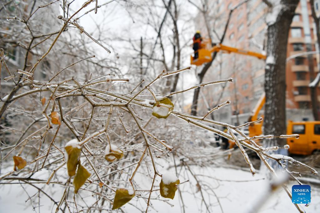 A staff member of local gardening department clear fallen trees in Harbin, northeast China's Heilongjiang Province, Nov. 9, 2021. Faced with the recent cold weather and snowstorms, the local authorities have launched an emergency program to ensure local power, gas and heat supply, guaranteeing people's normal life. (Xinhua/Wang Jianwei)