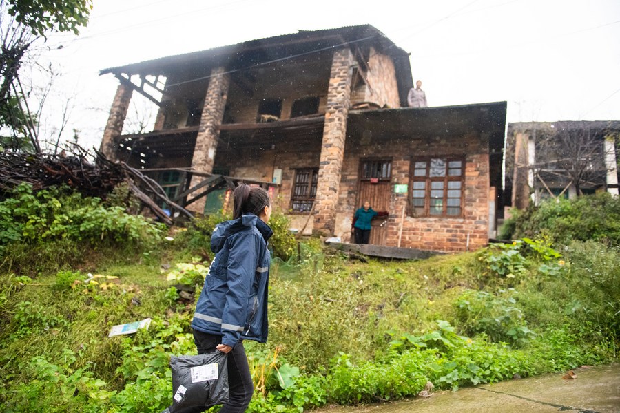 Hu Xia is on her way to deliver packages in Jinping Village of Huangshi Town in Leiyang, central China's Hunan Province, Nov. 3, 2021. (Xinhua/Chen Sihan)